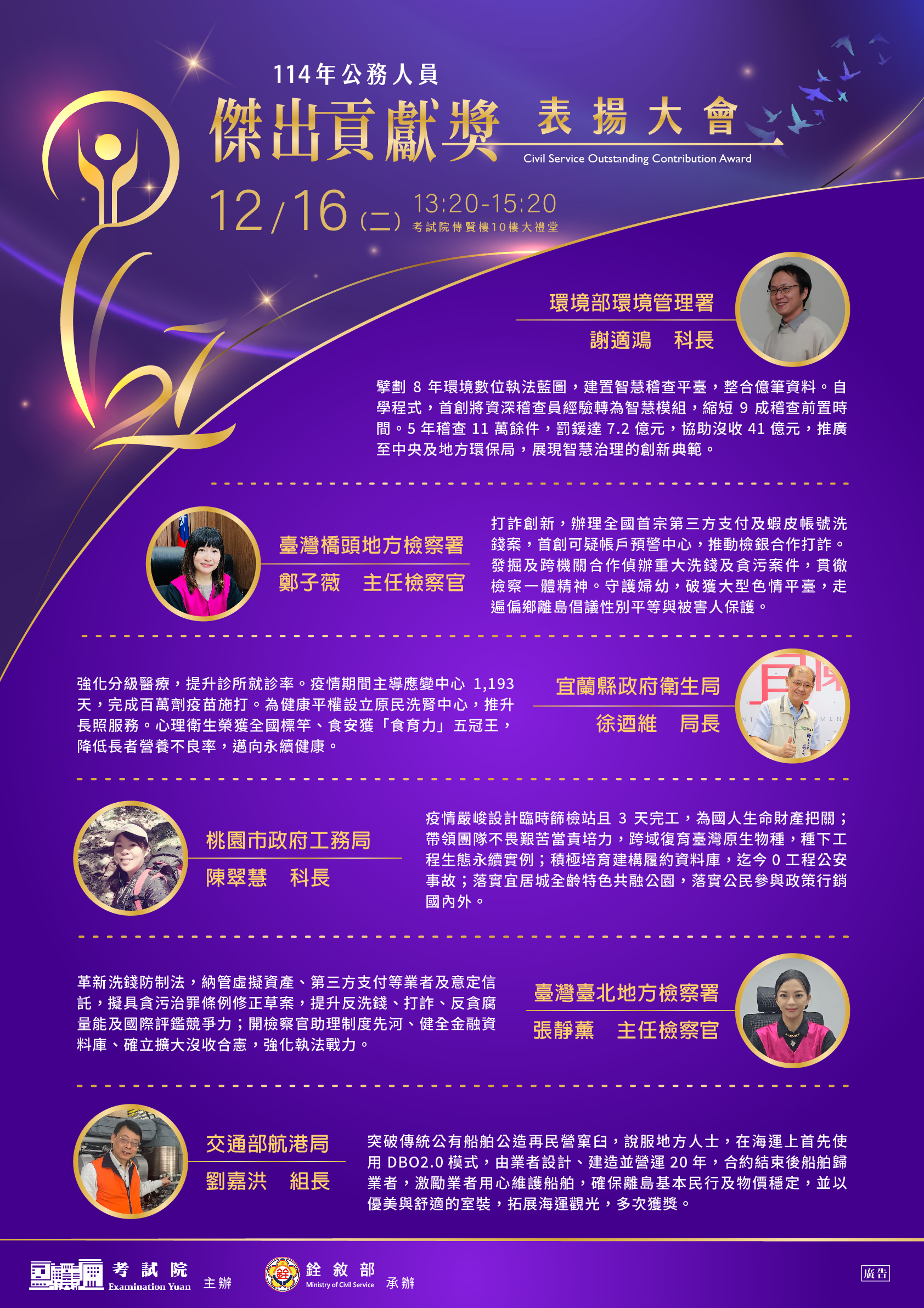 一、114年公務人員傑出貢獻獎業經考試院組成評審委員會評選出6名得獎人及6組得獎團體。為表揚得獎者傑出事蹟,考試院訂於114年12月16日(星期二)下午1時20分於考試院傳賢樓10樓大禮堂舉行表揚大會。