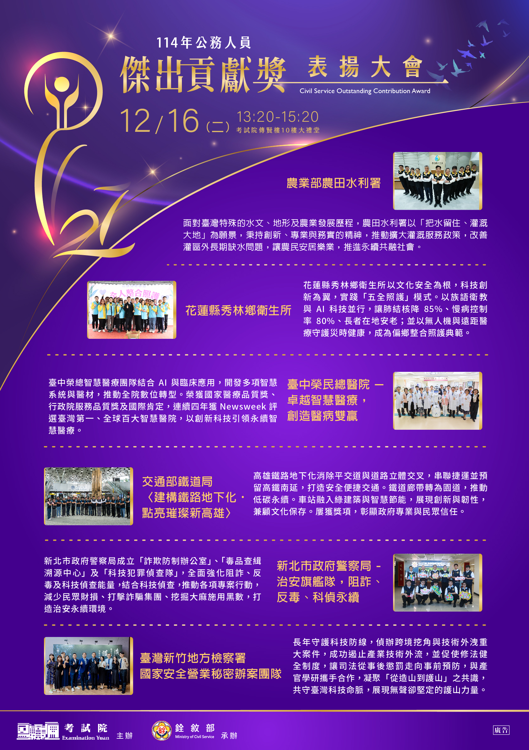 二、檢附「114年公務人員傑出貢獻獎表揚大會」個人獎及團體獎電子海報各1份。