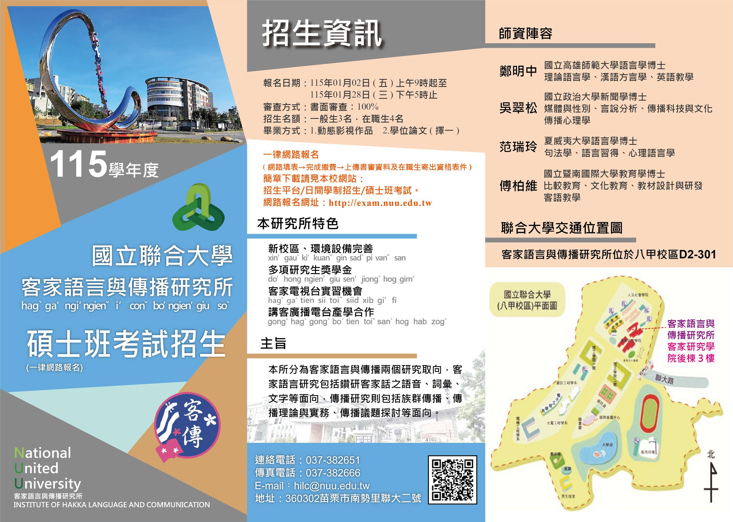 二、該校客家語言與傳播研究所115學年度碩士班考試招生,報名日期自115年1月2日(五)上午9時起至115年1月28日(三)下午5時止。