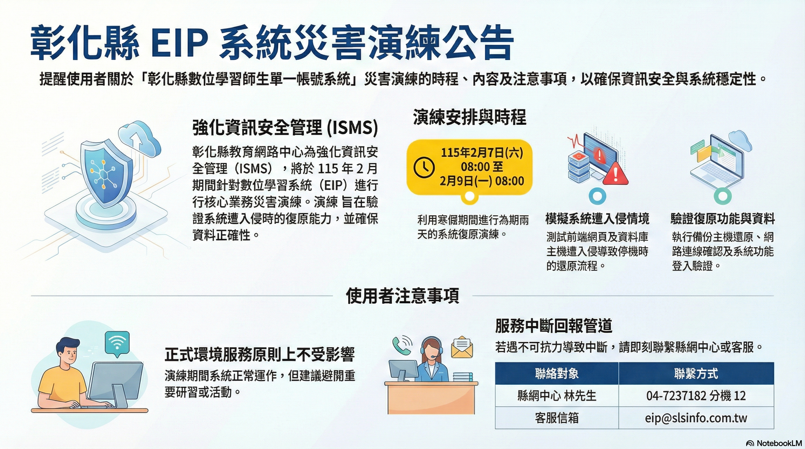 -「演練情境(前端網頁主機及資料庫主機疑似遭入侵跡象,導致系統無法運作)」:採還原彰化縣數位學習師生單一帳號系統備份主機,確認演練測試環境之網路連線情形,並經登入後驗證,復原系統功能、復原資料正確性...等至可恢復正常作業。